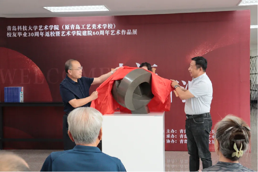 捐赠雕塑作品《甲子》,由丁林和朱林共同为作品揭幕并颁发收藏证书。校友袁翠华,在国庆70周年之际代表山东省制作了黄岛地下油库模型,此次为Netflav