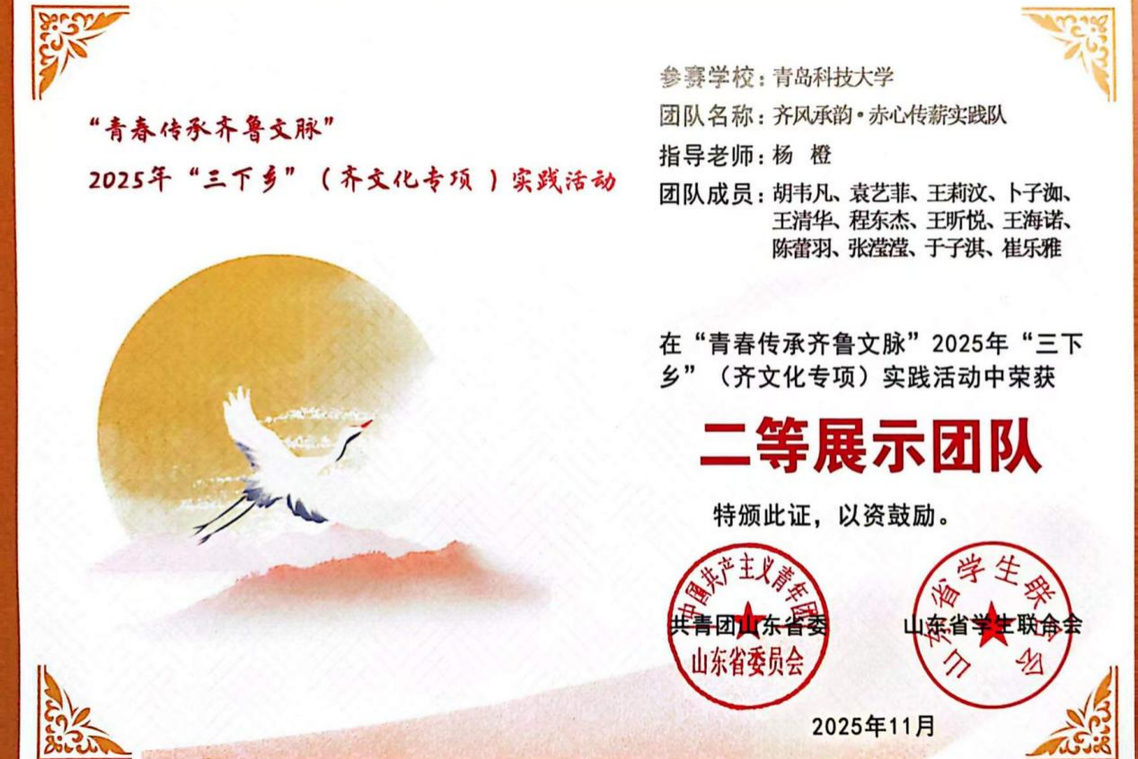 “齐风承韵・赤心传薪”实践团队在“青春传承齐鲁文脉”山东省“三下乡”活动中,凭扎实实践与创新表现脱颖而出,获省级二等展示团队荣誉。此次专项活动由共青团山东省委、山东省学生联合会于2025年暑期开展,吸引省内外88所高校319支团队、3200余名师生参与,经层层评议,50支团队进入实践阶段,最终30支入选交流展示名单。
