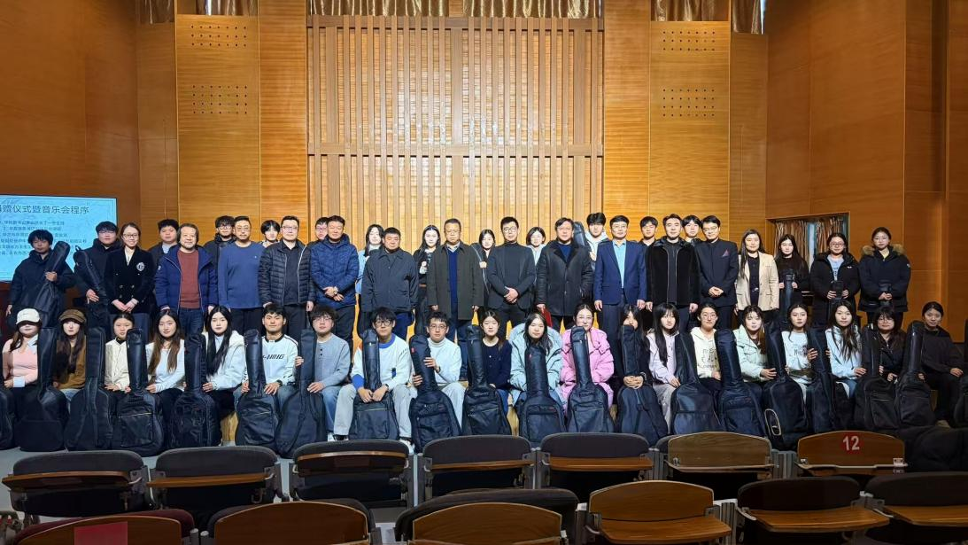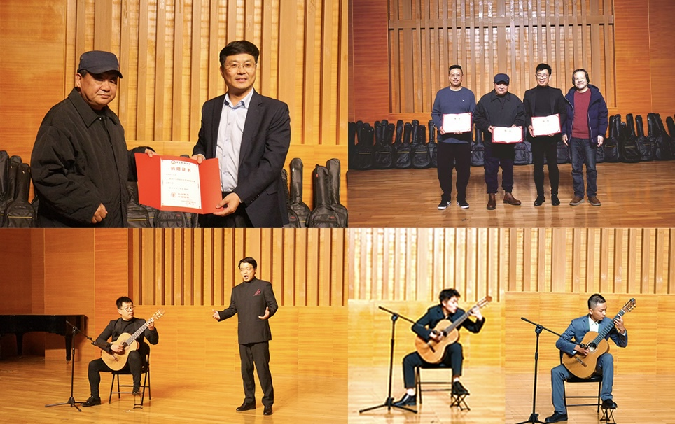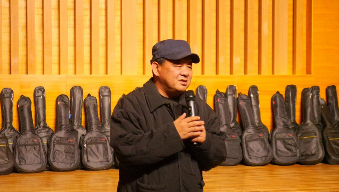 卢中彬向王生雷赠送捐赠纪念证书,李宏文向王生雷、王右、王闰颁发校外合作导师聘书,现场还向学生发放了四十五把吉他。捐赠仪式结束后举办了庆祝音乐会,王右老师、李猛老师和学生们表演了精彩的节目。