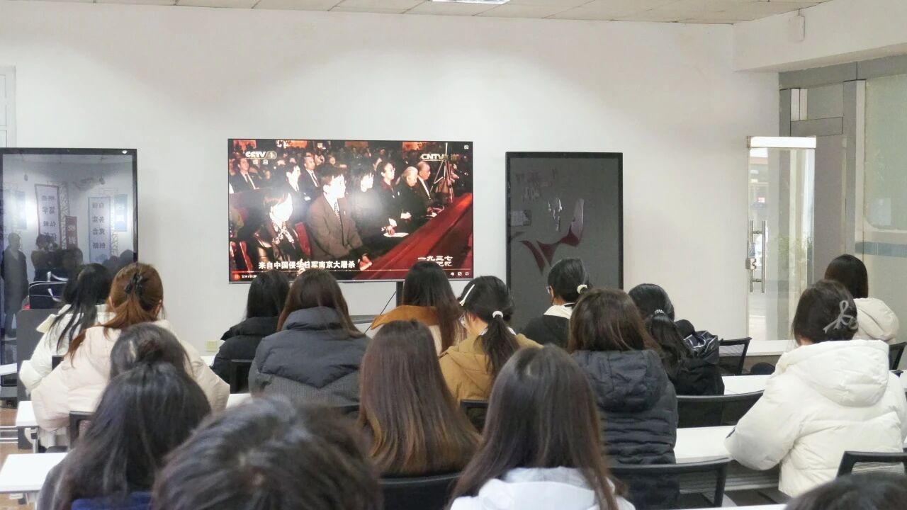 随后,师生共同观看了历史纪录片《1937南京记忆》。影片通过真实影像与珍贵史料,再现了1937年南京城的悲壮历史,揭示了战争的残酷与和平的宝贵,令在场师生深受震撼。