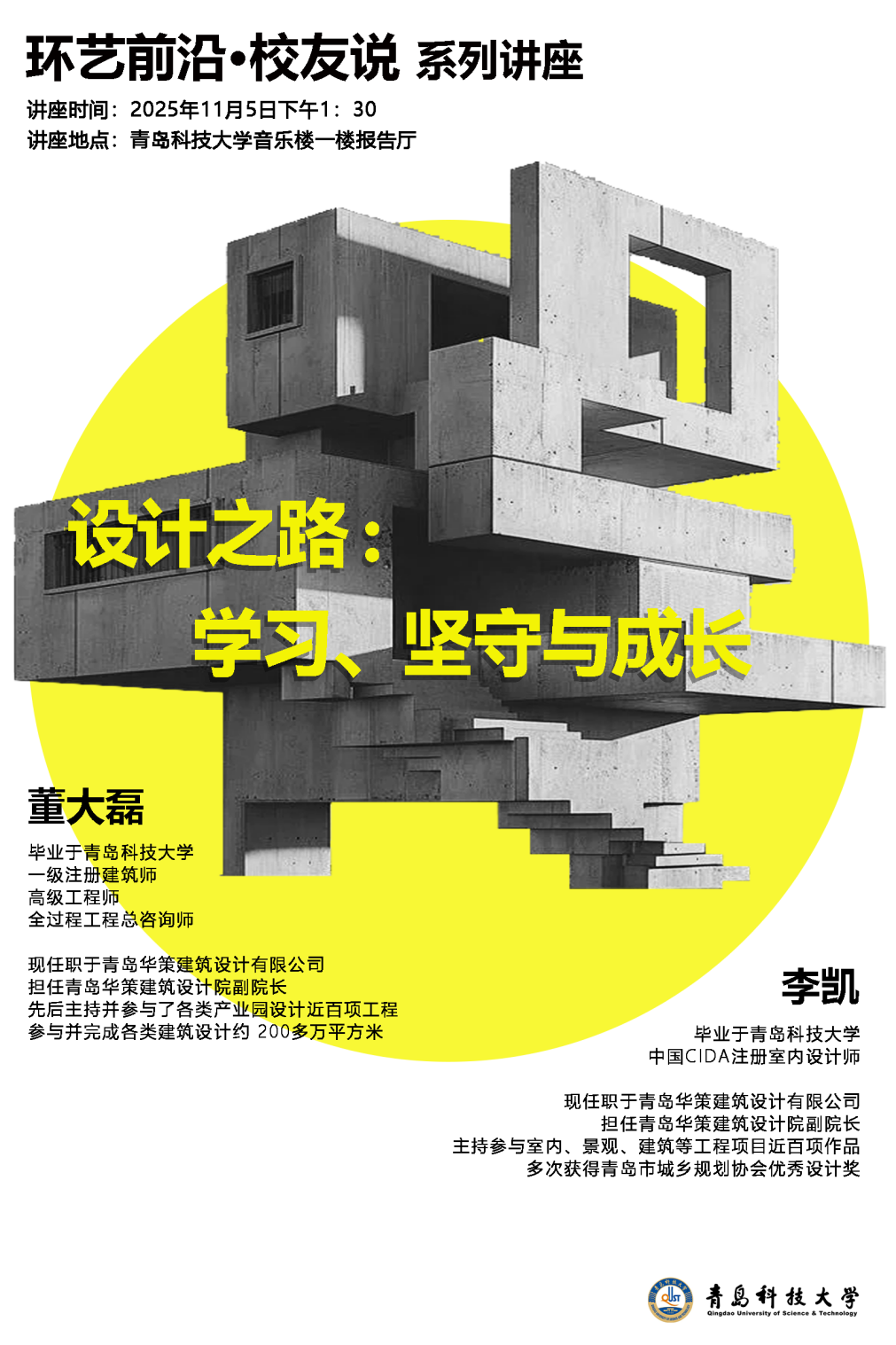 环境设计2002级杰出校友董大磊、李凯,2001级杰出校友曾彬彬重返母校,以“设计之路:学习、坚守与成长”为题,为在场师生带来了一场兼具行业深度与人生温度的思想盛宴。