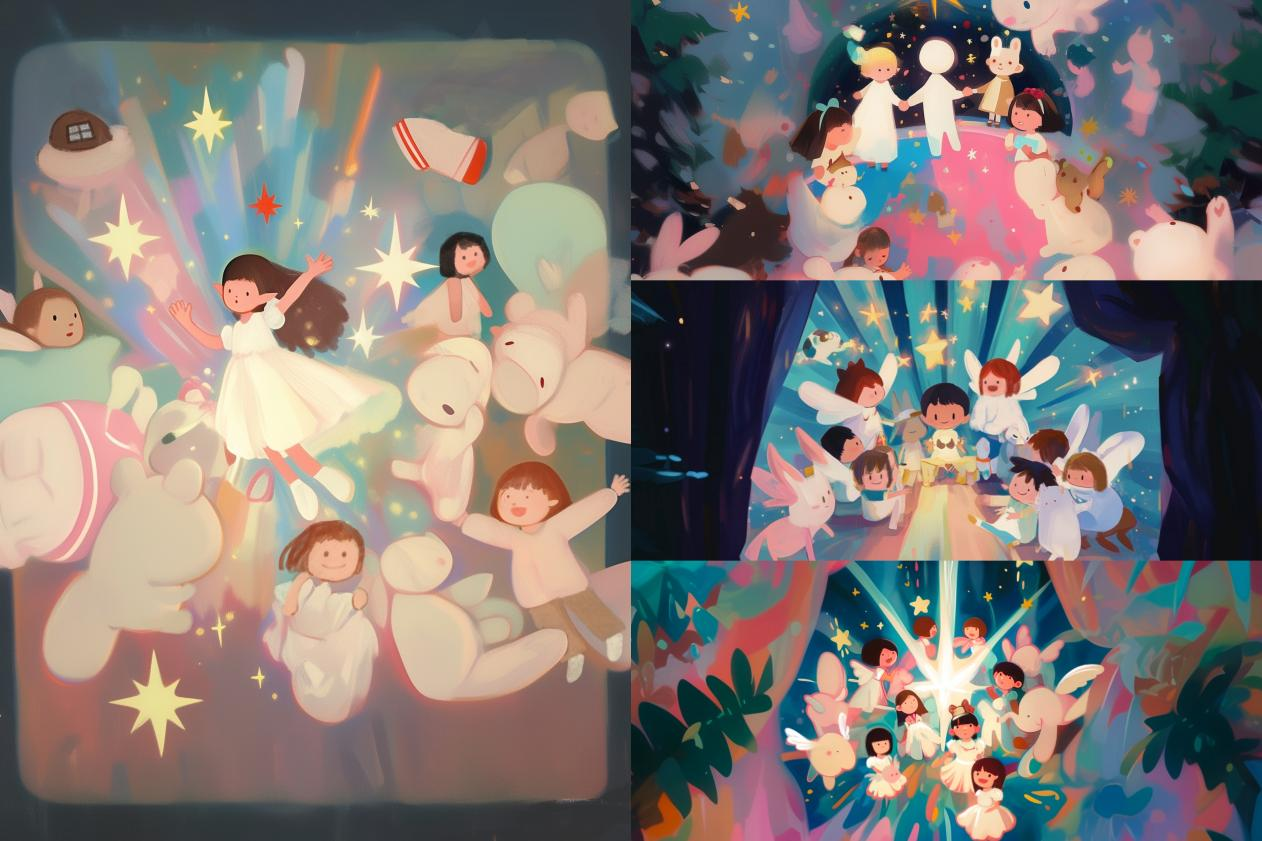 作品说明:整幅画面充满了童真和想象力,小女孩们的纯真笑容、动物们的可爱形象以及植物的翠绿色调,都让人感受到了生命的活力和对美好生活的向往。片通过细腻的笔触和丰富的色彩搭配,成功地营造了一个充满奇幻与温馨氛围的场景。它不仅仅是一幅描绘小女孩们欢聚一堂的画面,更是一个关于纯真、快乐、梦想和美好生活的寓言。