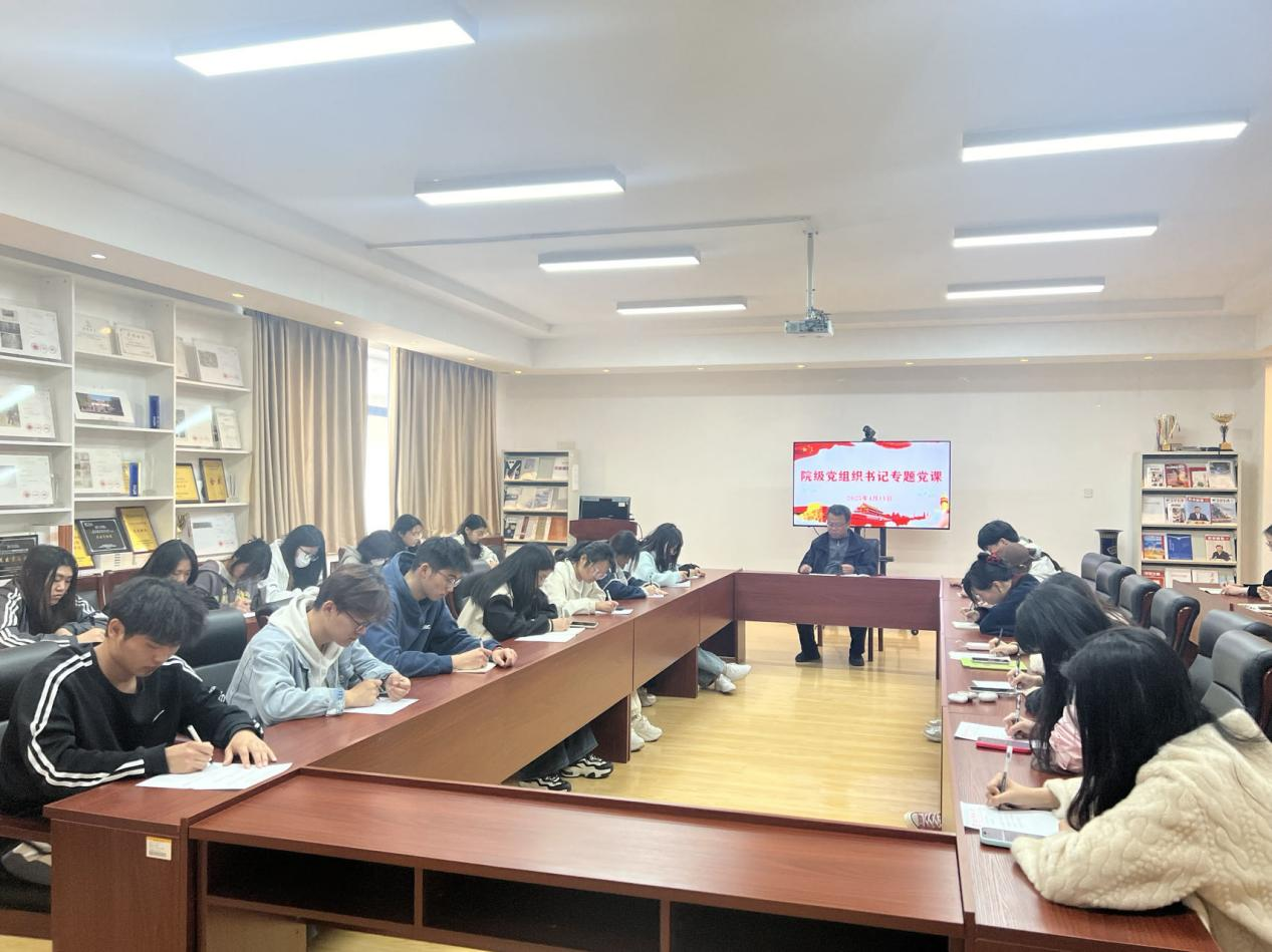 党委书记刘庆在213会议室讲授深入贯彻中央八项规定精神学习教育专题党课。教职工党员、学生代表共计30余人参加党课学习。