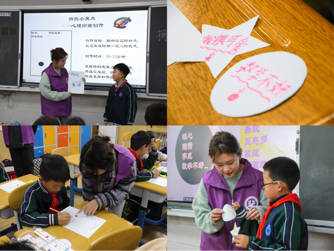 绘梦内心,拥抱不完美的自我。在“艺术姐姐”团队的指导下,同学们以笔为媒,对纸上的小黑点进行创意绘画,将心中的思绪与感悟化作一幅幅生动的画卷,尽情挥洒着他们的所思所想。在绘画过程中,“艺术姐姐”团队慢慢指引他们转化负面标签,这让同学们深刻领悟到每个人既有优点也有缺点,体验悦纳完整自我的积极感受。